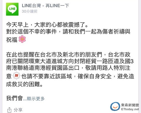 「LINE台灣-再LINE一下」則於下午14點30分發文為傷者祈福,並提醒用戶有關周邊道路管制訊息,同時強調「我們會一起度過這個哀慟的時刻,台灣加油!」