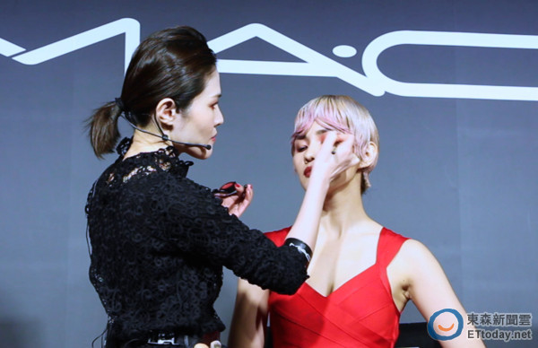 ▲ 彩妝師示範紅色眼影的上妝技巧。(圖/記者李薇攝)