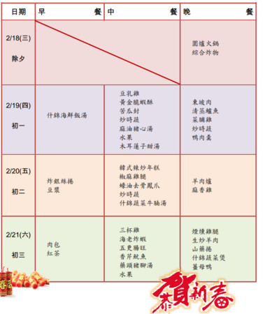 根據看守所的預定菜單,除夕當晚準備了暖呼呼的圍爐火鍋,新年的第一餐則以營養的什錦海鮮湯飯做為開頭,讓大家「吃飽飽,過好好」,接下來還有許多美味佳餚,包括黃金脆蝦酥、清蒸鱸魚、羊肉爐、椒麻雞腿、麻香雞、藥頭豬腳湯、薑母鴨、海老炸蝦、生炒羊肉以及五更腸旺等,更是讓大家看得口水直噴。