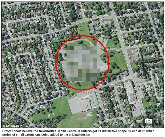 根據《每日郵報》報導,加拿大安大略省的紐馬基特醫療中心(Newmarket Health Centre)的建築是一棟棟相結合,而空拍照的形狀竟形式一名裸男,不但有頭、手臂、膝蓋、甚至連生殖器官都沒有少;而有趣的地方在於,如果你要進去醫院,還必須先從大腿間的「生殖器處」進入。
