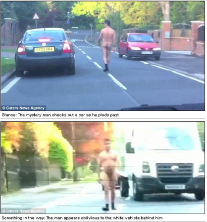 一個神秘男子出現在光天化日的大馬路上,只穿著鞋子和襪子,看得路上的駕駛人目瞪口呆!