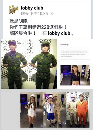 「就是明晚,你們別錯過228派對啦!部隊集合啦!」「LOBBY」臉書粉專在27日PO出敏感文字,並貼出多張穿著軍人、警察制服照,甚至也以國旗為背景、標題寫著「我愛台灣」、「LOBBY CLUB 2/28 SATURDAY」等字眼,只要民眾穿著整套的三軍或警察制服,深夜12時以前入場,女生100元、男生500元。