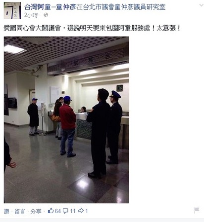 台北市議員童仲彥9日上午前往愛國同心會位在西寧南路的總部會勘,指同心會成員亂丟菸蒂、違停、聚賭。愛國同心會總幹事張秀葉下午赴北市議會理論,找不到童仲彥,直接猛嗆議員助理「你算老幾」,一旁成員還附和說「台獨都是膽小鬼」、「台獨份子是中華民國寄生蟲」,一行人謾罵大鬧市議會一樓大廳。