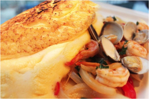 人氣菜色舒芙蕾烘蛋,主廚推薦新口味「蒜香辣味海鮮」,香味上的刺激與新鮮彈牙的鮮蝦與蛤蜊,配上微微的辣味更顯鮮甜,與風味燉飯一同享用,口感層次鮮明,是餐廳必點料理。
