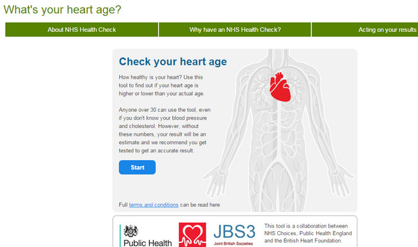 英國國民保健署(NHS)最近推出一個新的線上服務,讓網友能夠對自己的「心臟年齡」進行測試,在輸入年齡、性別、種族、血壓、有無家族病史等個人資料後,便會計算出每個人的心臟年齡,同時預測得到心臟病或是中風的機率,甚至告訴使用者大約可以活到幾歲,也針對個人狀況提出保養意見。