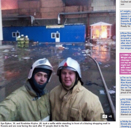 外媒報導,俄羅斯喀山市一家購物中心旁的咖啡廳發生大火,30歲貝科夫(Ilya Bykov)與28歲克雷洛夫(Rostislav Krylov)奉命前往救援,當時有55人受傷被困火場,2名消防員非但未先滅火救人,甚至擺出笑臉自拍上傳臉書。該火警最後奪走17人性命。