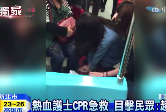 一輛由捷運府中站開往亞東醫院的捷運車上,13日一名吳姓老先生突然在車廂內倒下,這時一位身穿牛仔外套的長髮正妹,立刻對老翁施作CPR,再加上一旁民眾熱心協助,2分鐘後老翁恢復了意識。目擊民眾對這位正妹讚譽有嘉,而她的職業正是白衣天使,熱血救人行徑感動許多人。