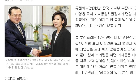 根據《朝鮮日報》報導,劉建超16日與羅卿援會面,羅卿援說,「我看過您的簡歷,擔任發言人很久,我也在初選議員時做發言人很久,我們有共同點。」劉建超則表示,「若我們兩個人一起召開新聞發布會,記者們可能都經常見委員長(羅卿援),因為您是美女。中國也對美女十分關注,美女很受歡迎。」羅卿援回答,「跟我有共同點的您訪問韓國,對此表示感謝。」(上圖/翻拍朝鮮日報)