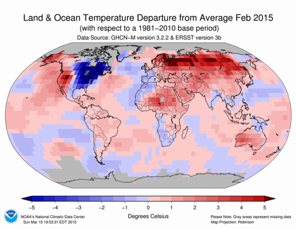 鄭明典還說,「歐亞大陸也是一大片偏暖區域,尤其以斯堪地那維亞(Skandinavien)的異常高溫更顯著!」另外,從美國國家海洋暨大氣總署(NOAA)的資料中也發現,2月的全球平均海平面溫度為0.51度,不僅高於20世紀的平均值,也是1880年至2015年間的第三高紀錄。