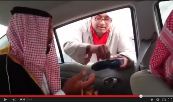 從畫面中可以看到,身穿黑色長袍的男子聽到急促的敲窗聲於是搖下車窗,車外的白衣男子往車內探頭,,並張望後就開始乞討,但前者表示,他有好工作錢不是問題,目前身上只有信用卡,還將皮夾掏出證明沒說謊,這時後者突然從口袋裡拿出刷卡機,還「順手」接過傻眼黑袍男的信用卡開刷。