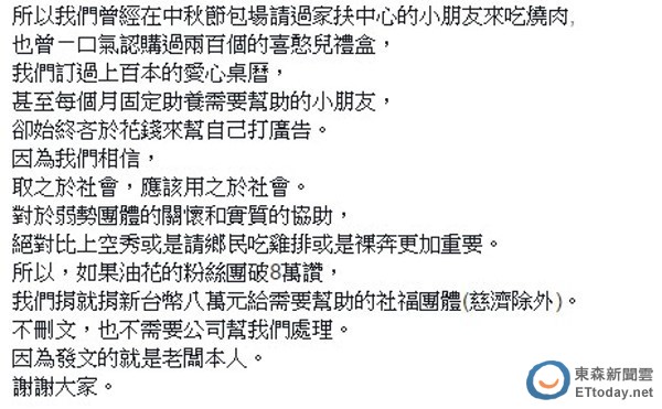 文章指出,他們相信取之於社會,應該用之於社會,對弱勢團體的關懷和實質協助,絕對比上空秀、請鄉民吃雞排或裸奔更加重要,因此若粉絲團破8萬讚就捐8萬元,「不刪文,也不需要公司幫我們處理,因為發文的就是老闆本人。」