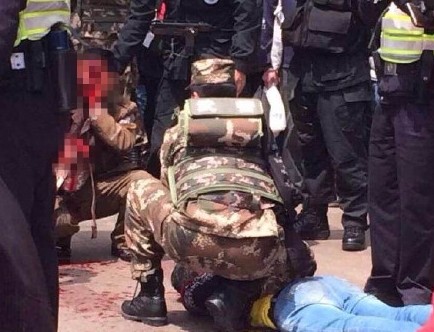 根據網友爆料,中午12點20分左右,在上海西藏中路九江路口,人群中忽然有一名男子持刀砍人。照片顯示,有人頭部受傷。目擊者表示,人民廣場南京路步行街一直到九江路上,有10多公尺長的血跡。