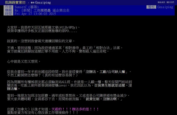 SunsetC表示,「看到這種:因為政府通過某某「相對善待」員工的「相對合法」法案,資方就瘋狂跳腳說這樣訂單不用做、人力不夠、變相殺人逼出走啦,心中就是又怒又想笑。」她表示,周圍有很多朋友加班沒加班費,過年或旺季禁休,資方還要求大家共體時艱,讓她不禁感嘆「薪水跟辛苦程度成反比。」她也指出,對比國外服務業如何處理人力問題,台灣資方總是以「共體時艱」、「加班是責任制」等理由剝削勞工,她剛開始雖試圖以「沒辦法,公司缺人」或「百貨業生態就是如此」等理由讓自己釋懷,但等到出國後才發現「天殺的!辦法多的是,重點是資方有沒有心想改善工作環境條件。」
