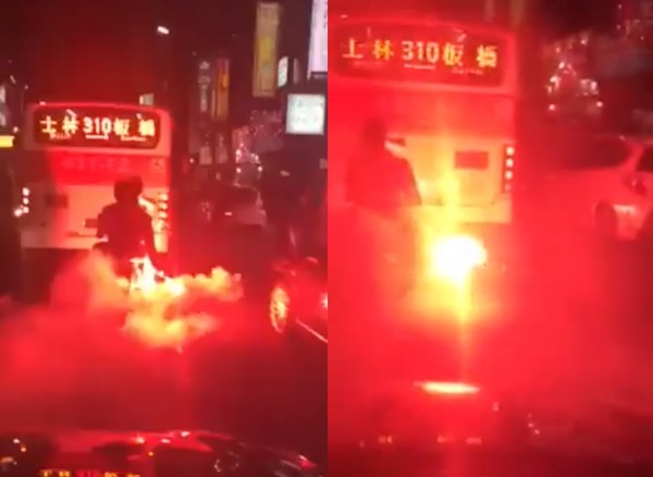 影片中,可以看到這輛機車行駛在310路線公車後面,騎士一直按喇叭,機車後座的男子拿著不斷冒出濃煙的信號彈,他們大喊某人欠錢不還。