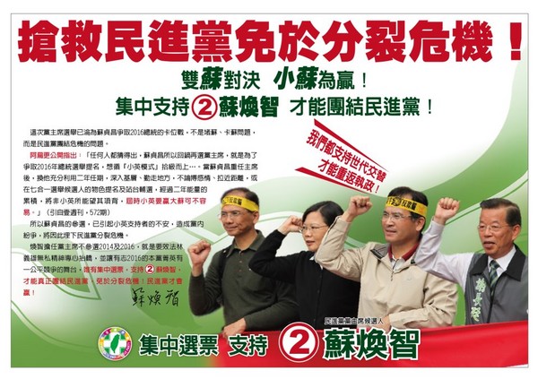 事實上,蘇煥智自參選來,不斷拋出黨務改造、社會福利等各項政見,24日更推出文宣,呼籲黨員「搶救民進黨免於分裂危機」,強調雙蘇對決、小蘇為贏,強調這次黨主席選舉,已淪為蘇貞昌爭取2016總統的卡位戰,不是堵蘇、卡蘇問題,而是民進黨團結危機。