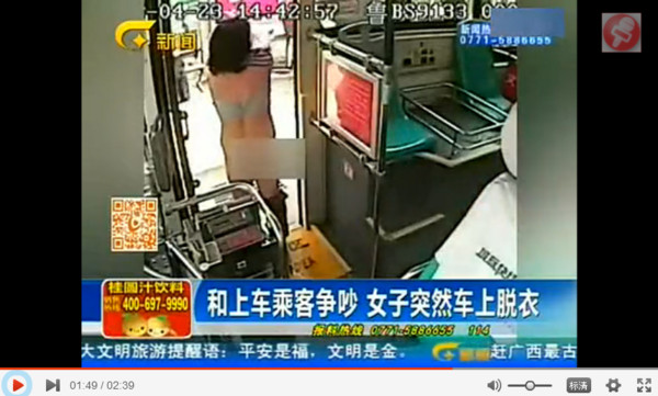 山東省青島市的公車上發生女乘客失控,搭訕司機徐方東不成,竟扮起售票員,因為乘客不順她的意,竟當眾咆哮並脫光衣物,之後更下車在街頭怒罵對方;當地警方表示,女子可能患有精神疾病,需要到醫院進行治療,以免病情惡化。
