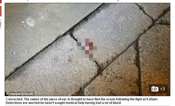 疑似派對酒後起爭執,一名男子耳朵遭咬掉!英國街頭日前驚見遭咬掉的「半耳」,且上面還留有一顆鑽石耳環,讓目睹的民眾嚇壞了!