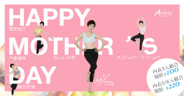 溫馨的母親節即將來臨,由國民瑜珈天后LuLu老師代言的無鋼圈內衣第一品牌Andria安卓亞,在康乃馨飄香的五月天,希望讓辛勞的媽咪和妳,能在忙碌的生活中停下腳步,享受健康樂活人生,與LuLu老師一起擁抱舒適!【洽詢專線:2765-1860】