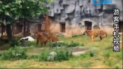 浙江杭州富陽野生動物園日前上演驚奇的一幕,有一隻丹頂鶴不小心掉到虎園,老虎本來有點傻住,都沒動,但後來開始追逐,沒想到丹頂鶴張開翅膀,用嘴啄老虎,老虎嚇得後退。