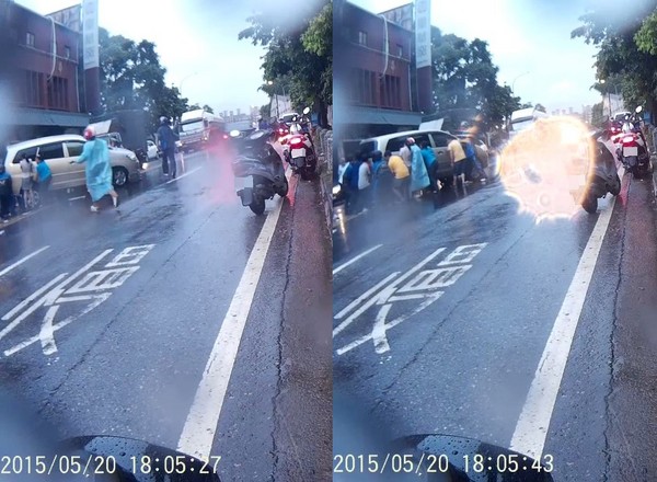 根據網友「簡盛安」上傳的行車記錄器影片,當時正下著雨,許多穿雨衣的騎士經過車禍現場,還來不及脫安全帽,立刻停車上前幫忙,加上附近熱心路人,一群人不分男女奮力地抬車20秒,救出被壓在車底的騎士。一名抬完車的婦人還揮動雙手要來車注意。