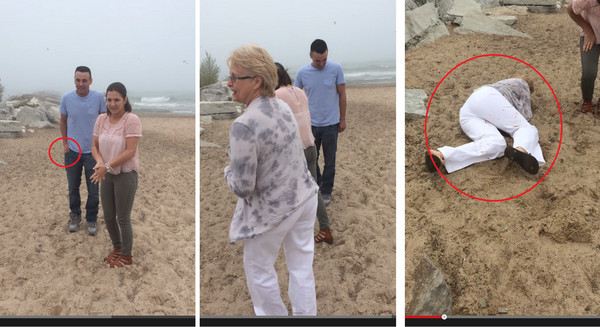 這段求婚影片應該會讓這個家族回憶久久,從影片一開始,藍衣男子就準備從口袋中拿出求婚戒,卻被可愛的女友媽媽入鏡打斷,過後又第二次入鏡,這次更大力成為焦點,因為她大跌倒,臉部直接往沙灘倒去,嘴上還一直說,「歐,我的嘴巴。」不過,也讓男子找到機會,趁機向女友求婚成功。