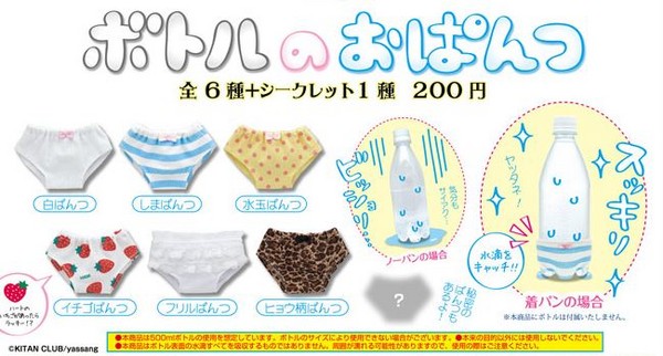 這款新奇的扭蛋名為「ボトルのおぱんつ」,意思就是「瓶子專屬的小褲褲」,是一款專門給寶特瓶穿的小褲褲。夏日民眾習慣飲用冰涼的飲料,但由於飲料溫度低於室溫,容易凝結水氣把桌面弄得濕濕的,這款小褲褲就是來幫寶特瓶接水的。