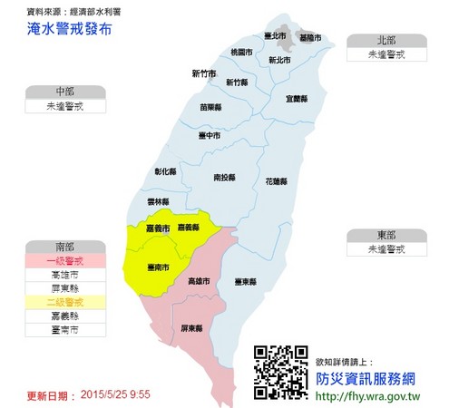 水利署今天也針對南部地區發布淹水警戒,高雄市及屏東縣被列為1級警戒,部分易淹水村里及道路可能已開始積淹水;嘉義縣及台南市則被列為2級警戒,如果持續降雨,其轄內易淹水村里及道路可能在3小時內開始積淹水。