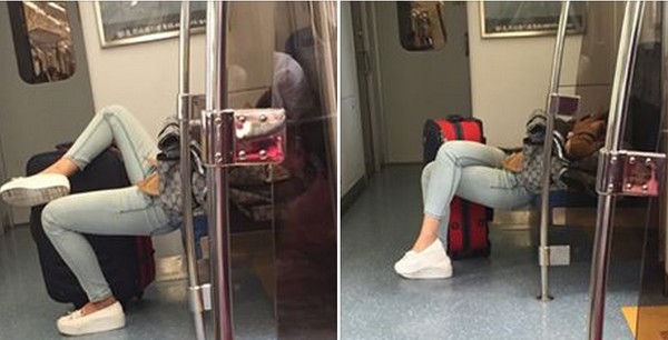 一名施姓網友在臉書社團「爆料公社」PO出幾張在火車上拍的照片指出,「超佩服這女生的睡姿,整個屁股騰空的睡在椅子上,行李箱甚麼的都倒了還在沉睡」,看到這麼高難度的睡姿,網友忍不住問,「要不要給她一條繩子,她是小龍女嗎?」