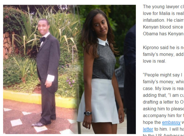 Felix Kiprono指出,從2008年開始就對Malia Obama有興趣,甚至從那時候開始就沒有再交任何女友,承諾要忠實於她,甚至家人也相當支持,還願意幫忙增加聘禮的價值。但他也表示,人們可能會以為我家很有錢,但其實不是這樣,只有我的愛是真的。