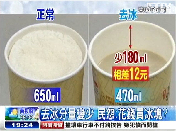 不少民眾到飲料店買飲料,會要求調整冰塊量的多寡,不過現在有民眾投訴,他要求茶湯會做「微冰」,卻發現飲料份量也跟著變少,甚至比店家自己規定、印在杯上的「拿鐵茶湯供應線」還低2公分,換算容量少了180毫升。民眾質疑,少冰就要少容量,如果正常冰,不就是花錢在買冰塊?