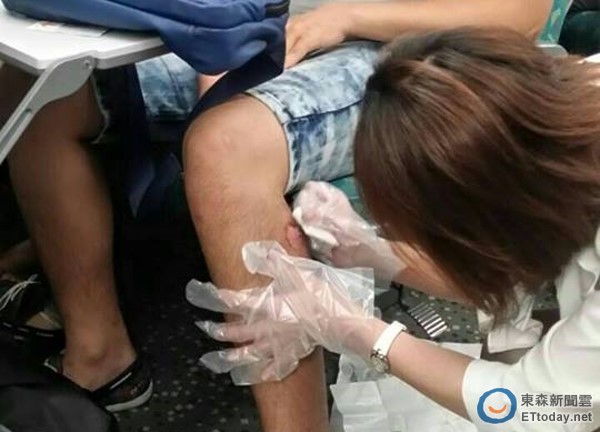 ▲高鐵服務員見乘客許桓嘉小腿有傷,立刻主動拿藥幫忙包紮傷口。(圖/許桓嘉提供)