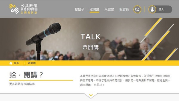 「公共政策網路參與平台」於2015年2月開站,共有「眾開講」、「來監督」、「提點子」、「找首長」四個專區,其中「眾開講」的反應較好,目前討論最熱烈的是農委會提出的「規劃寵物相關稅收,以解決流浪犬經費問題」以及法務部提出的「通姦罪應否除罪?」,各有一萬多名網友投票反對。