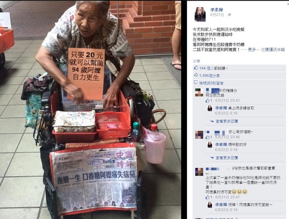 李柔樺希望大家一起幫助這位阿嬤,因為「每次做完善事心情都超好的」,而文章也吸引超過一千名網友轉發,更有人留言「每次看到都會買」、「好心人有好報」。