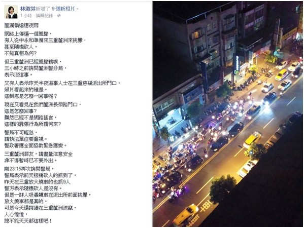 林淑芬指,昨天半夜滋事人士又在三重慈福派出所門口,照片看起來的確是,「現在又看見在我們蘆洲長榮路門口,這是怎麼回事?顯然已經不是網路謠言,這樣的囂張行為所為何來?警局不可輕忽」要求執法單位要重視,警政署應全面協助緊急應變,還提醒三重蘆洲朋友請盡量注意安全,非不得已暫時不要外出。