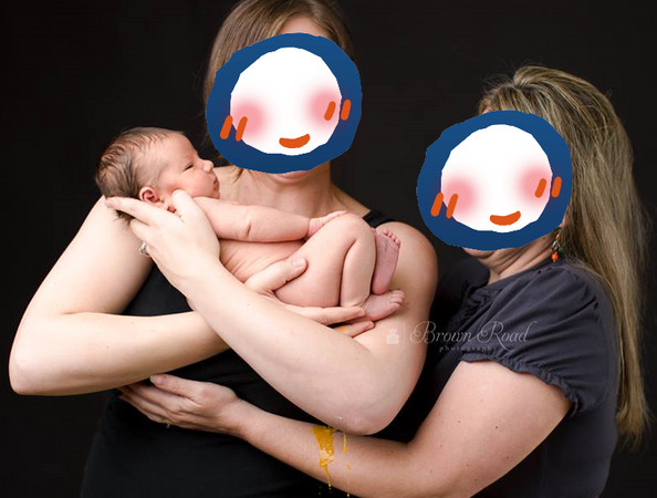 從這張照片中可以看見,抱著熟睡嬰兒的母親蜜雪兒(Chelsa Mitchell)與一旁嬰兒的奶奶,3人正拍攝溫馨的家庭照片,但蜜雪兒的衣服及奶奶的手上,卻出現黃色物體,而且除了嬰兒以外,其他兩人的臉上,都露出尷尬神情。
