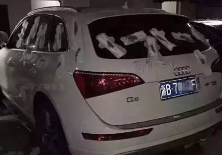 寧波之前就有女友因為氣男友沒回家,於是用衛生棉貼滿車子,而現在當地也有類似事件傳出,但是這輛中招的白色奧迪Q5狀況有些不同,那就是這次的衛生棉全部都是「用過的」,而且車子上還被寫字,「給不了她婚紗,就不要脫褲子。」