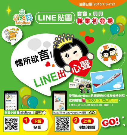 即日起至7月21日期間,到【LINE貼圖小舖】搜尋「BabyBoss」下載寶寶x貝貝(職業初登場)貼圖,讓可愛的BabyBoss職業角色為大家傳達職場心聲,豐富與朋友之間的對話,將貼圖對話截圖上傳活動網站,還有機會抽中日本雙人來回機票及多項好禮!