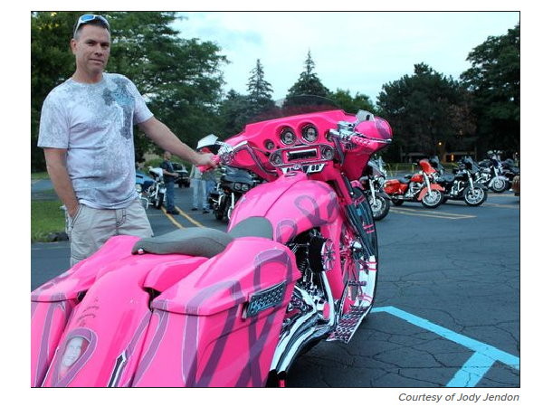 根據《TODAY》報導,這名深情的丈夫杰登(Jody Jendon),他曾告訴自己的妻子史黛西(Stacy),要打造一輛重機送給她當禮物,但妻子不幸在2011年因為乳癌過世,為了要兌現承諾,杰登買了一輛重機,將車身漆成粉紅色,甚至車尾還嵌入妻子的照片,並寫上「在愛的回憶裡」(In loving memory of)幾個字來紀念妻子。