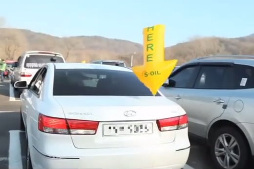 南韓有人想到一個簡單又便宜的方式,能夠在露天超大停車場的滿滿車海中,簡單找到停車位。只要一條堅固的細繩,加上「箭頭向下」的黃色充氣氣球,上面寫著HERE,栓在停車格尾端。沒車時候,細線的長度剛好讓氣球飄起約比成人高,駕駛從遠處就能看到鮮豔的黃色氣球,箭頭向下寫著HERE,代表那裏有空位,浮在空中的明顯目標,比起駕駛人只能用平行視角找車位更容易辨識。