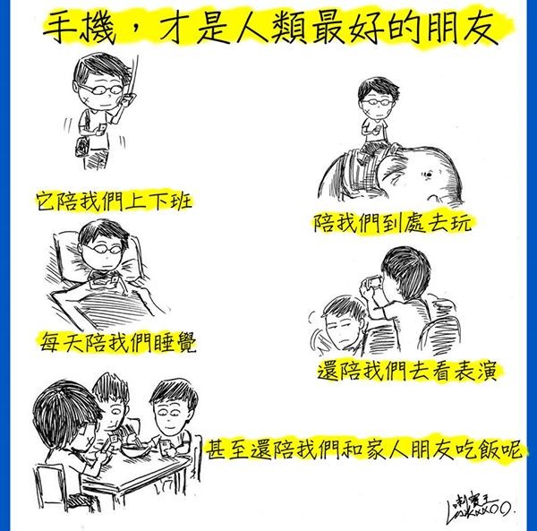 隨著智慧型手機日益普及,「低頭族」的情況也更常見了,許多人手機不離身,而插畫家「喇賽王」最新作品「手機,才是人類最好的朋友」,畫出手機的重要性,因為它陪我們上下班、到處去玩、看表演、睡覺,甚至還陪我們和家人、朋友吃飯呢!