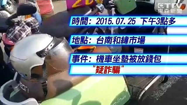 最近網路上流傳,指出機車坐墊上出現不明手提包或錢包,一碰就會有人跳出來,以涉嫌侵占的名義藉機勒索錢財。現在台南也發生類似事件,民眾買菜後發現一個顏色鮮豔的零錢包在機車坐墊上,而且1/3拉鍊是開的,怕是詐騙趕緊錄影存證,找來市場管理員幫忙。最後打開錢包,裡面什麼都沒有,雖然不能斷定是否碰上詐騙,但類似狀況層出不窮,搞得大家人心惶惶。