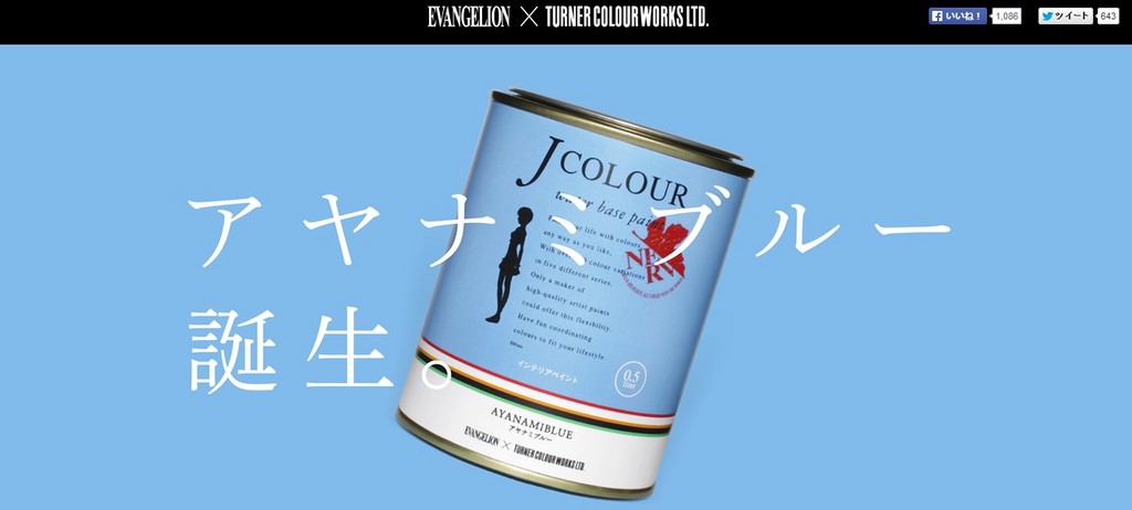 日本經典動漫《新世紀福音戰士》的周邊商品一籮筐,包括入浴劑、刮鬍刀架、流行配件、手遊等都可以聯名特別企劃,近日則是有ターナー色彩株式会社以人氣女性角色綾波零的藍色頭髮為靈感,調合出官方認定的新顏色「綾波零藍」,並推出水性油漆塗料販售,10月還將有壓克力顏料上市。
