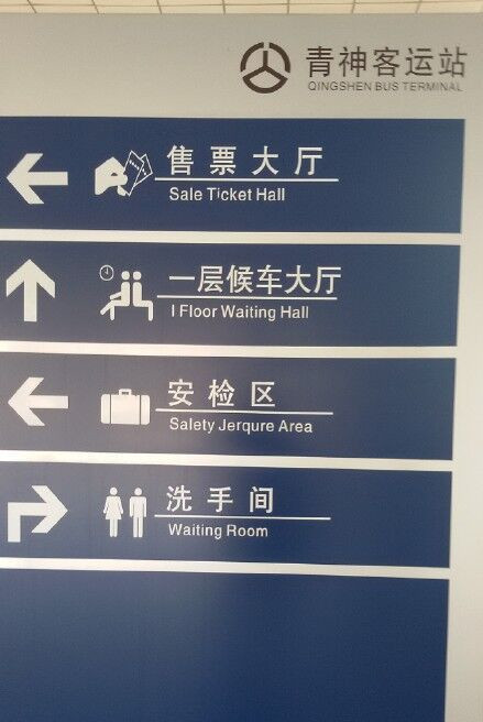 據《四川在線》報導,網友表示自己在青神客運站等車時,被指示牌上的文字給吸引住,原來上頭的翻譯超有特色,「售票大廳」被翻成「Sale ticket hall」;一樓候車大廳變成「Ⅰ Floor Waiting Hall」;安檢區則變成「Salety Jerqure Area」,更扯的是洗手間也可以翻錯,變成了「Waiting Room」。