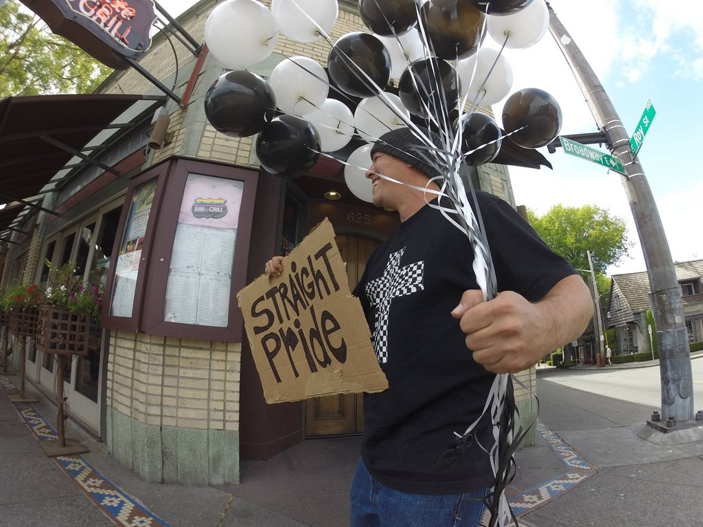 報導指出,該遊行為西雅圖最愚蠢的活動,安東尼一手拿著黑白兩色氣球,另一手高舉「異性戀」的牌子,他隨後稱那些不願出席的人是因為害怕被社會排擠,才不敢現身。