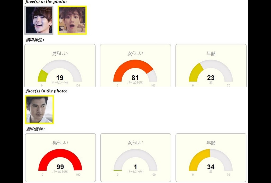 《ETtoday東森新聞雲》挑了幾位名人實測,發現「亞洲男神」金城武臉部男性指數高達99%,系統也顯示這張照片有31%像金城武;接著上傳南韓偶像男團EXO伯賢的照片,系統判斷後男性指數僅19%,女性指數達81%,年齡和實際一樣是23歲。