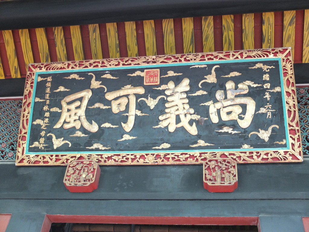 「尚義可風」匾額係光緒4年(1878年),林維源以母親鍾氏名義捐款2萬兩,救濟山西、河南兩地水災,朝廷為表彰善行所頒贈。匾額製作精美、字體渾圓飽滿,中間上方刻有「光緒御筆之寶」印,係來自朝廷正式賜匾,且背景圖案綴以七祥龍與五蝙蝠,展現林家地位尊崇,亦反映林家雄厚的財資能力。