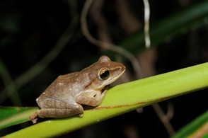 ▼斑腿樹蛙卵泡常黏著於植物或容器上,隨園藝植栽擴散至其他地方。