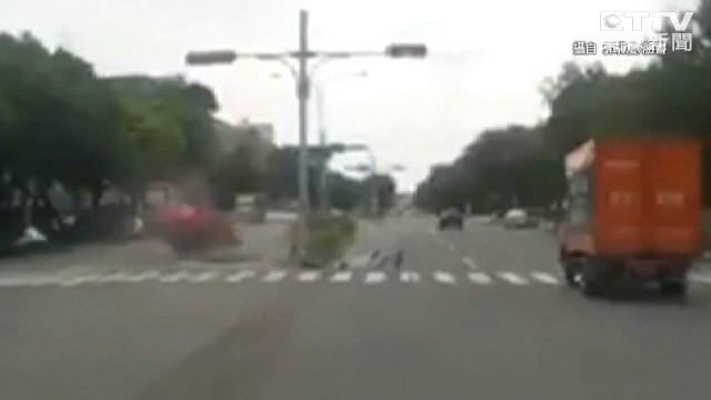 行車記錄器影像中,一輛紅色三菱轎車原本行駛在外側車道,卻越開越往內側車道偏,也沒有打方向燈,就在接近前方路口時,紅色轎車仍一路向左偏移,結果直接撞上前方中央分隔島,當場翻滾180度、車輪朝天躺在對向車道上。