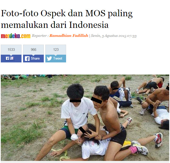 校園霸凌在許多國家都可以見到,印尼「獨立報」(Merdeka)近日刊登一系列校園迎新霸凌的照片,讓他們穿上怪異服裝、嘴咬拖鞋、惡搞化妝等,這些嚴重影響人權的霸凌照片釋出後,再次引起國際對於校園霸凌的關注和重視。