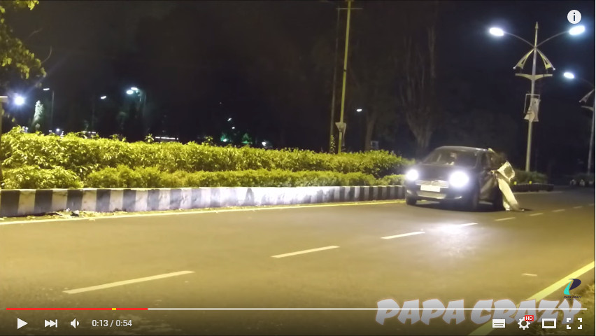 Papa Crazy在7月18日po出這段影片,片中一名黑長髮、穿著白衣的男子先從草叢旁跑了出來,經過的黑色轎車急剎完再快速倒車,沒想到後方又跑出另一隻鬼,這隻更誇張,一下撲車,一下作勢要跳上車,嚇得駕駛油門踩到底,直直向前衝,前方的鬼以為駕駛會剎車,還在甩頭揮手嚇人的時候,就直接被撞上。